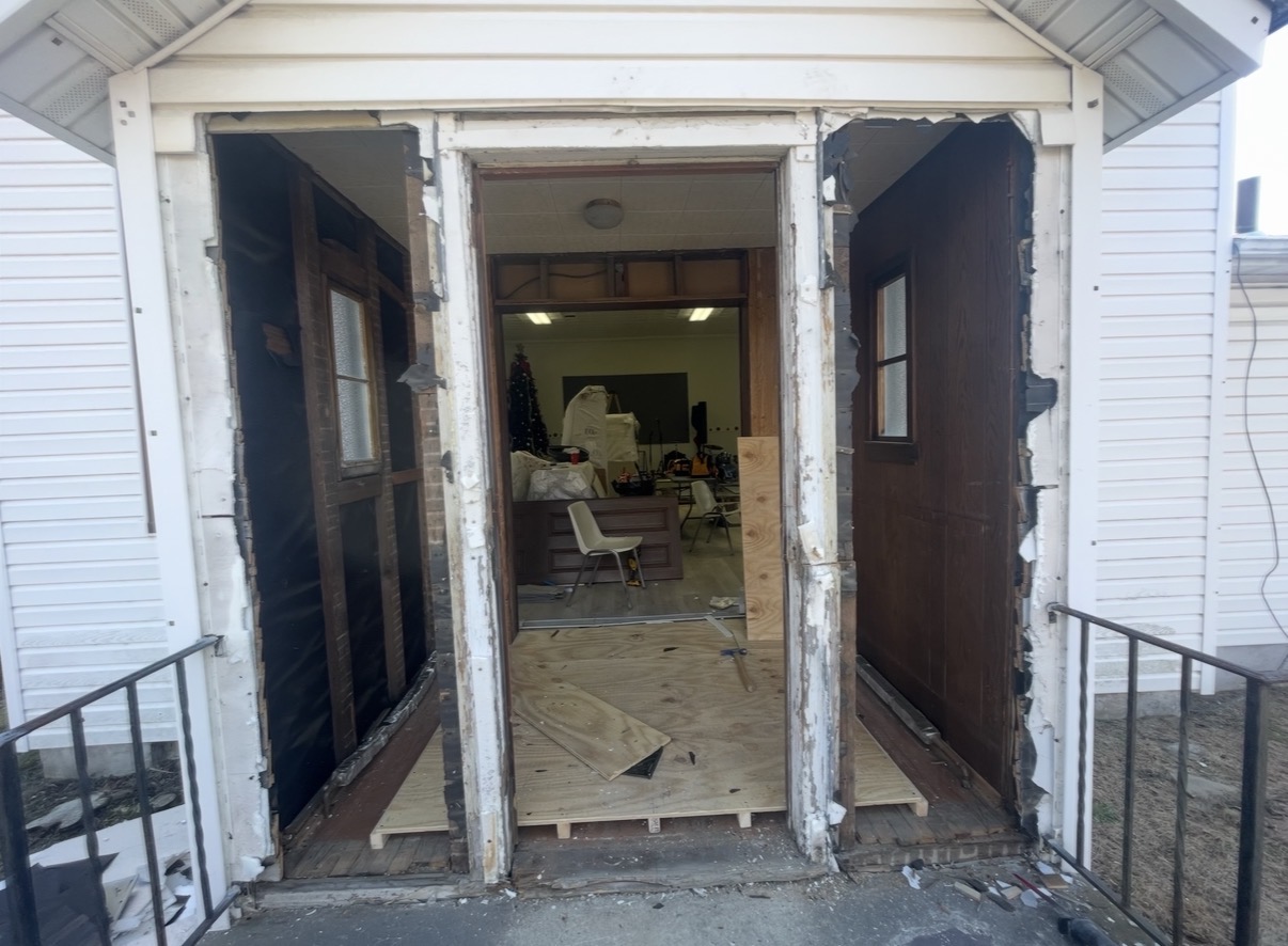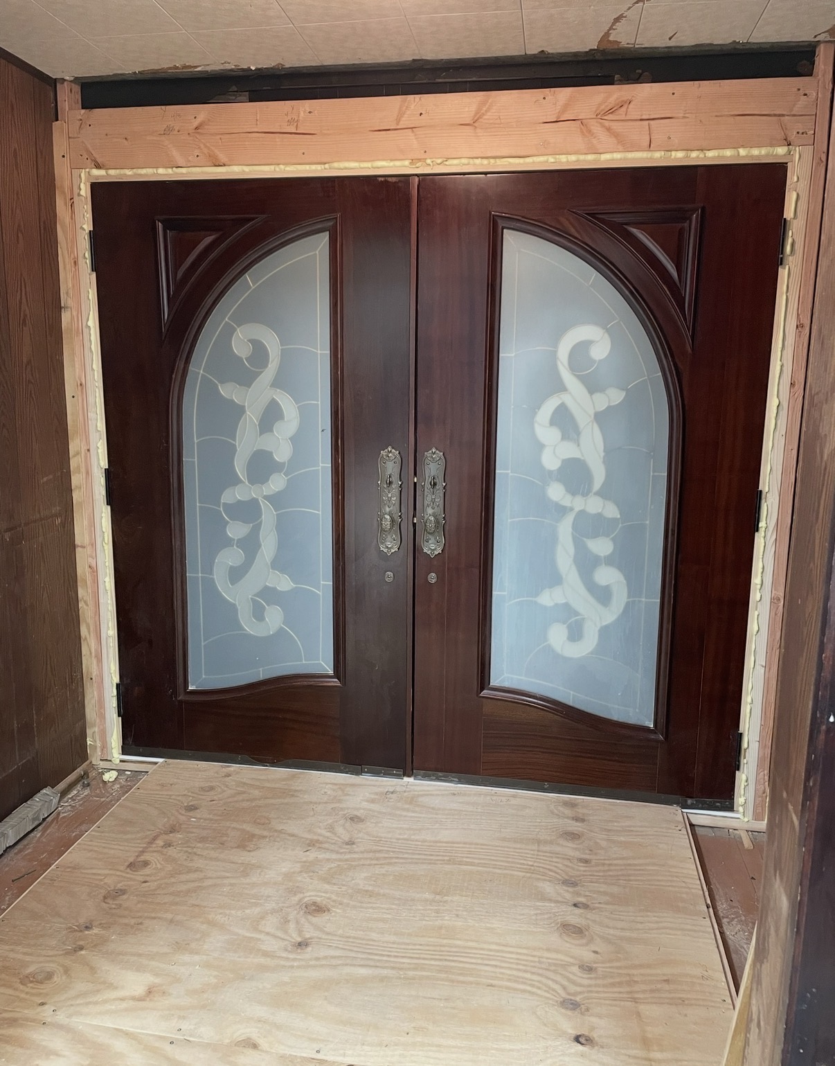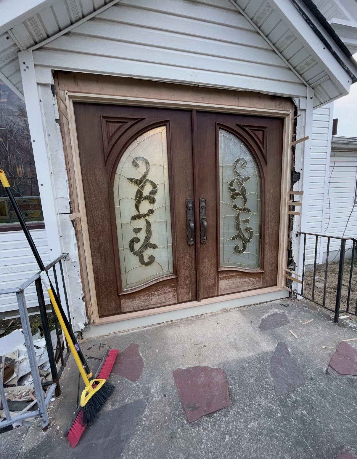 A historic church entry brought back to life — original leaded glass panels carefully preserved, set into hand-built mahogany doors and frames, finished in shellac and installed on site. The kind of millwork Scott loves most.
