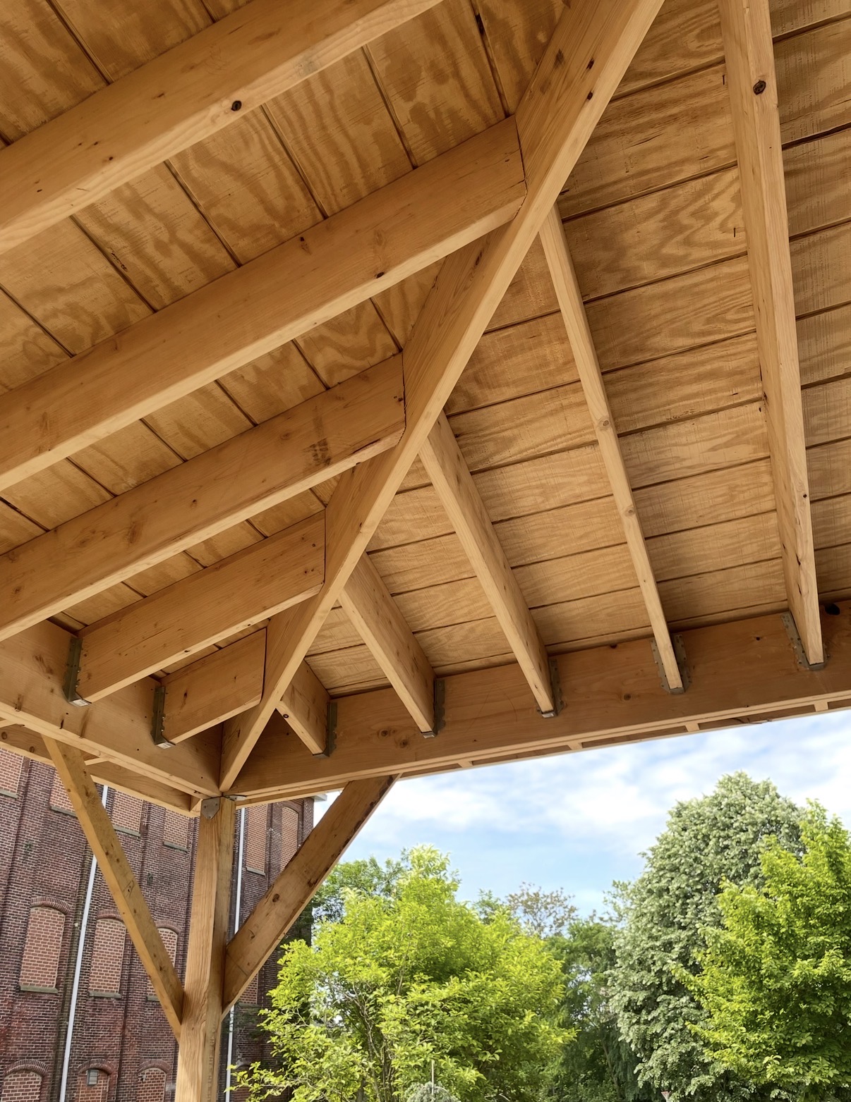 A one-off specialty build — clear-span timber pavilion in engineered glulam, framed and finished by Scott and his crew on site. Specialty structures like this are taken on selectively alongside our core remodel work.
