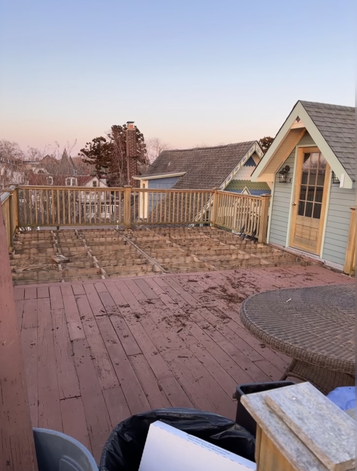 Full tear-off and rebuild of a rooftop deck — old painted boards stripped down to the joists, then refinished with tight-spaced mahogany decking, hidden fasteners and a clear oil finish.